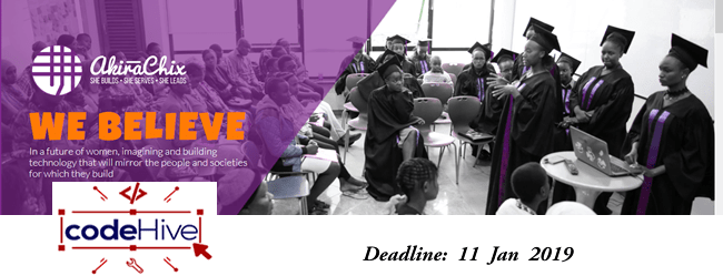 Are you a young Kenyan woman aged between the age of 19-24 and coming from a socio-economically disadvantaged background? If yes, AkiraChix is currently receiving applications for its CodeHive Technical Training program which is a one year fully funded hands-on technical training program that provides an education and economic opportunity to young women . These young women are those that have completed high school but due to financial constraints are unable to further their education. The program aims to develop capacity and skills in computer literacy, software development (for both mobile and web applications), hardware & product design, graphic design, entrepreneurship, life skills, communication skills, and professional development.
